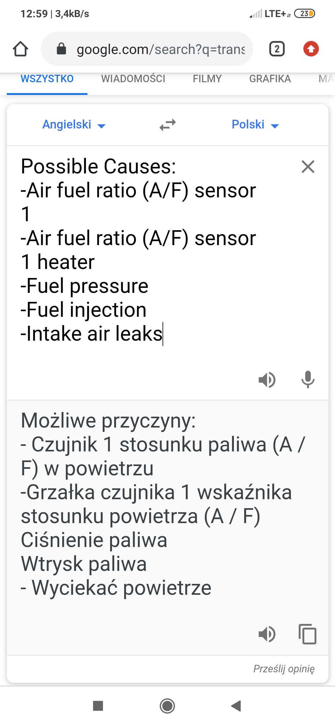 Przesyłam screenshoty z Torque, Piston, DTCs Fix oraz translatora Google z definicją.