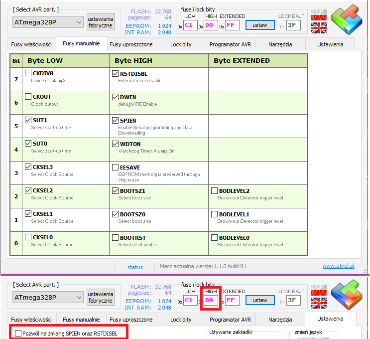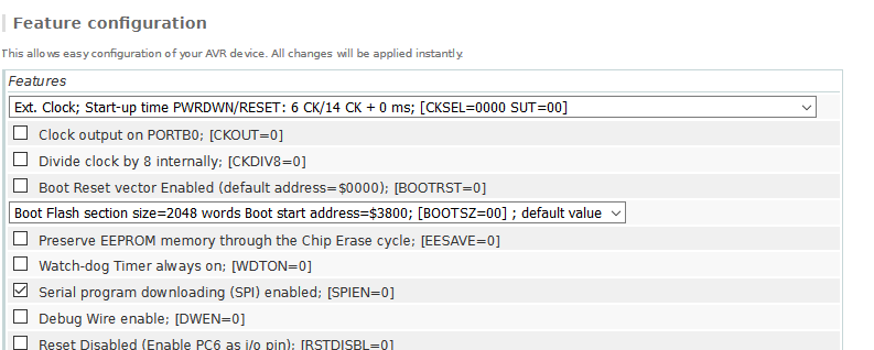 Jako kalkulatora używam https://www.engbedded.com/fusecalc/ (według mnie lepzy od mkAVR)