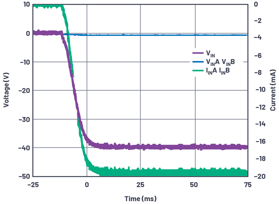 Rysunek 10 przedstawia rezystor 1,96 kΩ ograniczający prąd na wyjściu styków zasilania LTC2966 podczas wystąpienia odwrotnego napięcia. Napięcie wejściowe aplikacji zostało zredukowane z 0 V do –40 V. Prąd na wyjściu z pinów VINA i VINB jest ograniczony do 20 mA, a napięcie na pinach VINA i VINB jest utrzymywane na poziomie kilkuset miliwoltów poniżej masy. LTC2966 bezpiecznie przeżywa to zdarzenie.
