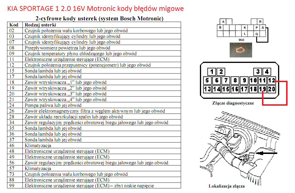 Pomocny post #5 19683128 31 Paź 2021 10:37 michal_rybka michal_rybka Poziom 35 Pomocny post? (+1) Pomocny post #5 19683128 31 Paź 2021 10:37 tam nie musisz się niczym podłączać, wystarczy 2 piny w złączu diagnostycznym zewrzeć i wymigać kod lampką CZEK https://obrazki.elektroda.pl/9074529800_1430756671_thumb.jpg instrukcja w załączniku (oczywiście tester nie potrzebny, tam jest tylko wyłącznik i dioda) tu masz dużo do Sportaga 1: https://chomikuj.pl/breakout85/Programy/Motoryzacja/Kia+Sportage dorzucę jeszcze taki skrót kodów błędów i włączania autodiagnostyki: Załączniki: tester-kia.pdf Download (194.08 KB)