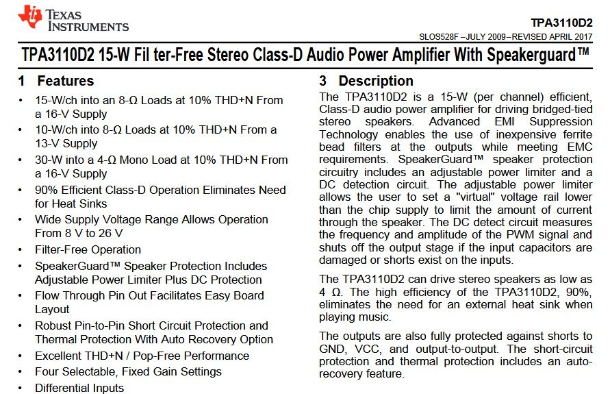 Nota katalogowa TPA3110D2 dostępna jest tu; https://www.ti.com/lit/ds/symlink/tpa3110d2.p...ef_url=https%253A%252F%252Fwww.google.pl%252F