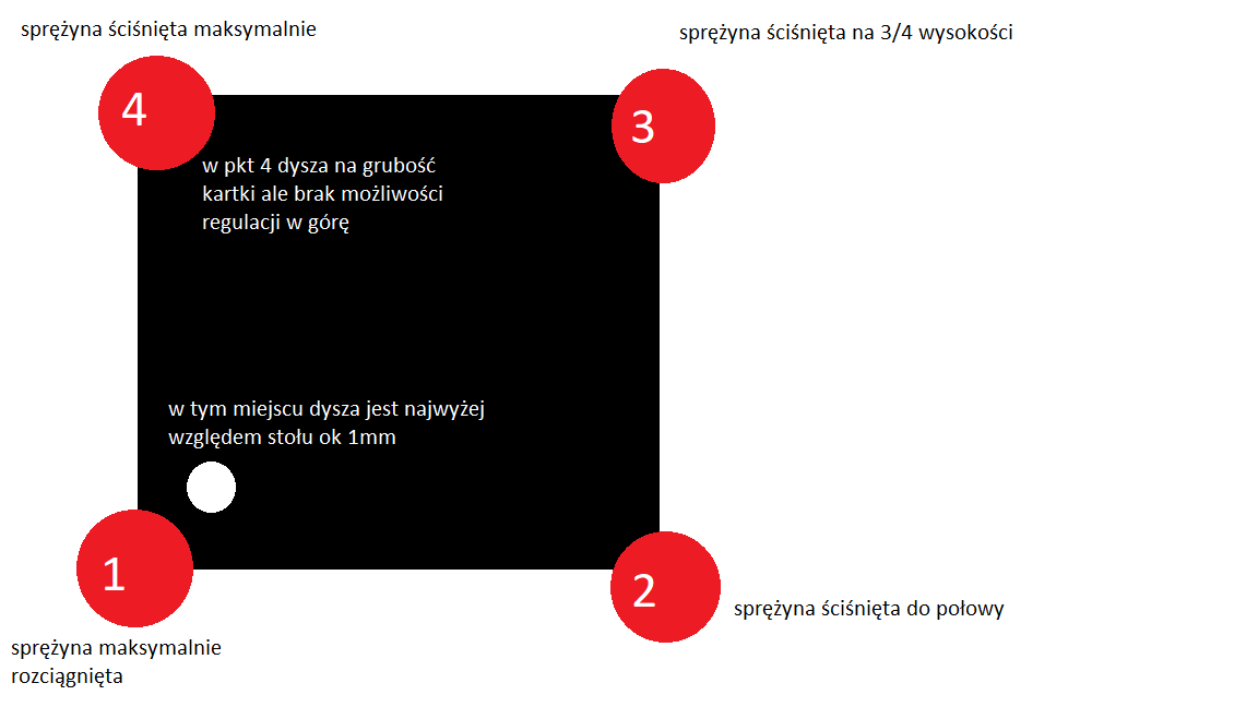 Witam! Od dwóch dni jestem posiadaczem drukarki anycubic i3 mega s. Po złożeniu drukarki zabrałem się za poziomowanie stołu według instrukcji jak i wielu różnych poradników na youtube. Podczas poziomowania stołu mam jeden i ciągły problem, mianowicie idąc punktami od 1 do 4 odwrotnie do ruchów wskazówek zegara za każdym razem kiedy ustawie punkt 1 tak aby był minimalny opór na kartce kalibracyjnej przejdę przez punkt 2 i 3 ustawiając je tak jak powinny to punkt nr 4 jest maksymalnie skręcony tak, że kartki nie idzie wyciągnąć spod głowicy zaś punkt 1 jest tak nisko względem głowicy, że nawet rozkręcenie maksymalnie śruby nawet jej nie zbliża do niej. Męczę się już drugi dzień próbowałem jak i z podkładkami tak i z ustawianiem wysokości na osi Z nic nie pomaga stół sprawdzałem prostym odcinkiem linijki w żadnym miejscu nie ma zakrzywienia jak i na bokach tak i przekątnych stołu. Osadzenie stołu na prowadnicach i zmierzeniu długości każdego narożnika względem podstawy jest na identycznej wysokości co wyklucza skrzywienie prowadnic w osi Y. Wysokość osi Z na obu silnikach jest taka sama. Zaczynam się zastanawiać czy ja coś źle robię czy może jest jakiś inny problem. Może ktoś z was miał podobny problem i wie jak sie z tym uporać. Liczę na waszą pomoc.