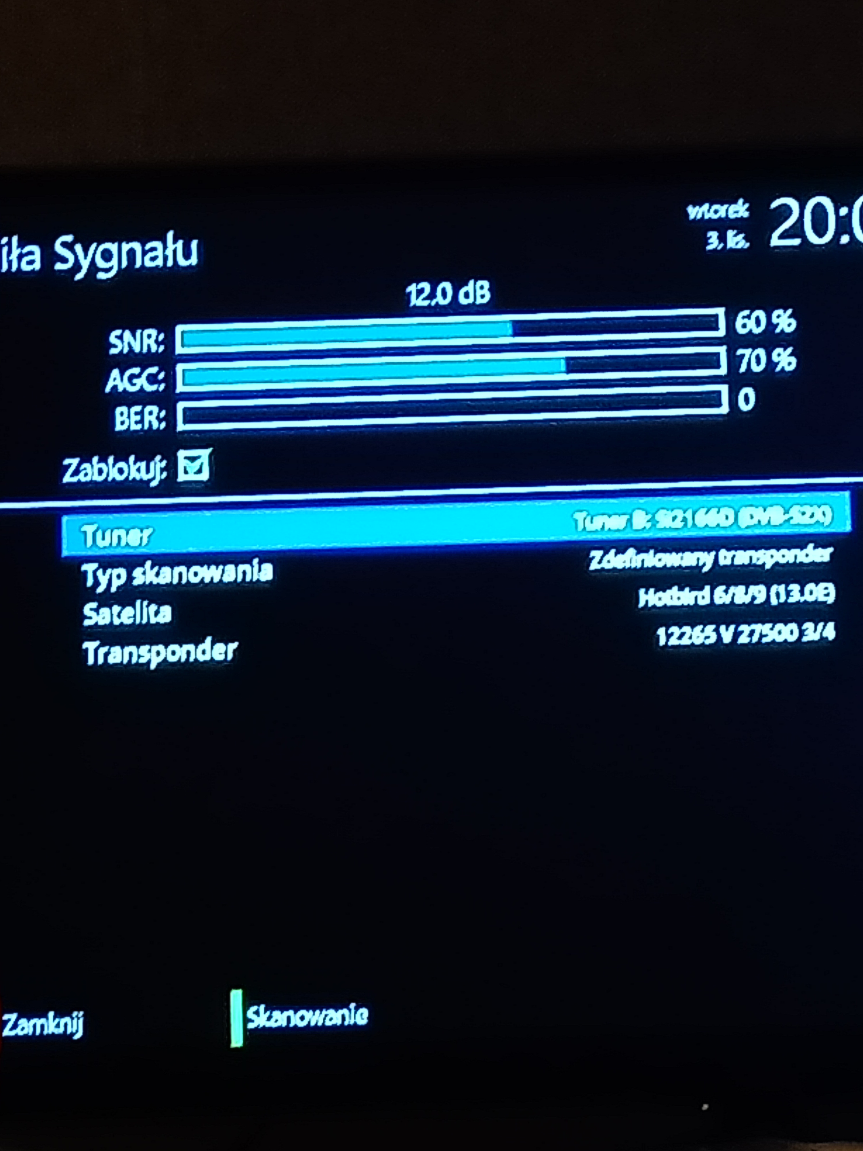 A teraz w czym problem. Na początku próbowałem ustawić antenę sam nie udało mi się myślałem że coś jest nie tak z dekoderem. Przywróciłem ustawienia fabryczne ( tu był błąd) Cały dekoder przystosowany przez sprzedawcę padł Wgrałem softa wysłanego przez sprzedawcę OpenAtv. Zaprosiłem. fachowca z miernikiem aby ustawił sygnał Ponoć sygnał jest bardzo dobry Czasze częściowo zasłania balkon który jest wyżej jak i te po lewej stronie które są piętro wyżej Kabel przymocowałem opaskami do balustrady przejście przez ścianę. Kanały zacinają się masakryczne SNR jest max 61% AGC 72-75% Kanały