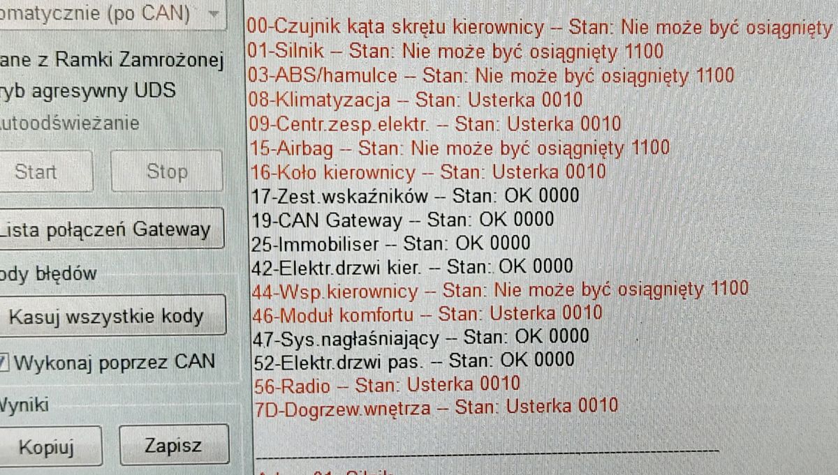 Witam, audi przyciągnięte na sznurku, stało długo brak historii auta, na desce choinka -oczywiście nie odpala (silnik nie widzi się z licznikiem po Can- i to wystarczy, świeci się wspomaganie na czerwono(działa poprawnie) Abs, trakcja, immo, airbag. Brak komunikacji Can (szybki, gałąź napędu) wszystkich elementów w lini Can na skrętce pomarańcz/czarny pomarańcz/brąz. Przewody Can sprawne, napięcie can około 2,5V. Na próbę zrobiłem immo off- auto jeździ. Ze sterownikiem silnika brak rozmowy po Can tylko po K. Łącząc się przez gateway brak komunikacji Can Napędu czyli: Silnik, Abs, Poduszki, Wspomaganie. Inne jak radio, komfort, bortnez, drzwi, klima, licznik komunikacja jest.