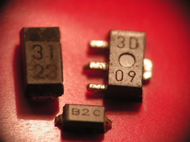 Proszę o pomoc w rozpoznaniu elementow smd. Przede wszystkim chodzi mi o tranzystor. Z pomiarow wynika, że jest to npn. Pomiar złącza emiter-kolektor wskazuje na uszkodzenie jeżeli jest to tranz.bip.(800mv, a w przeciwnym kierunku 400mv) Pozostałe elementy to chyba diody schott. Przeszukałem siec i dostępne katalogi bez rezultatu.