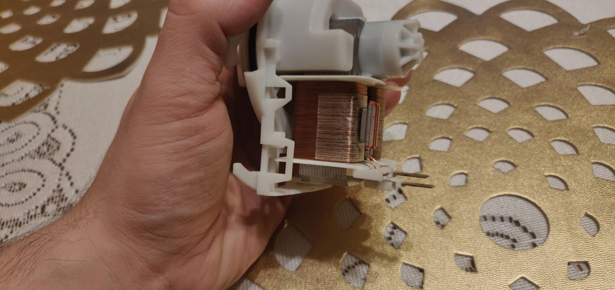 Wyciągnąłem pompę odpływową - nie ma żadnych niepokojących śladów zużycia, wirnik pracuje bez oporów, a sama oś nie posiada żadnych niepokojących luzów