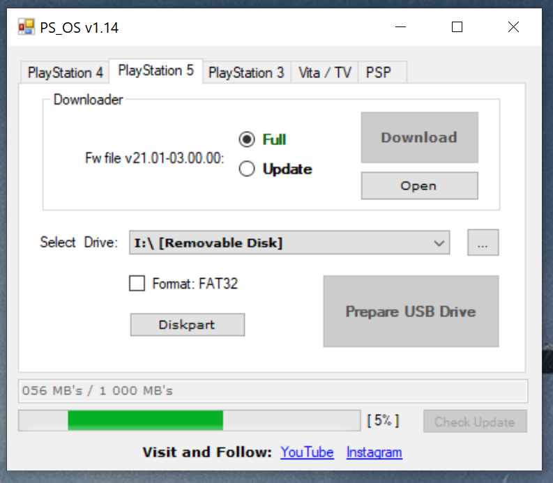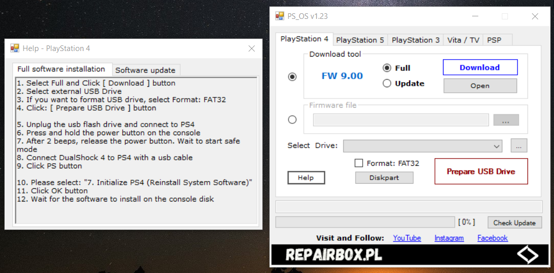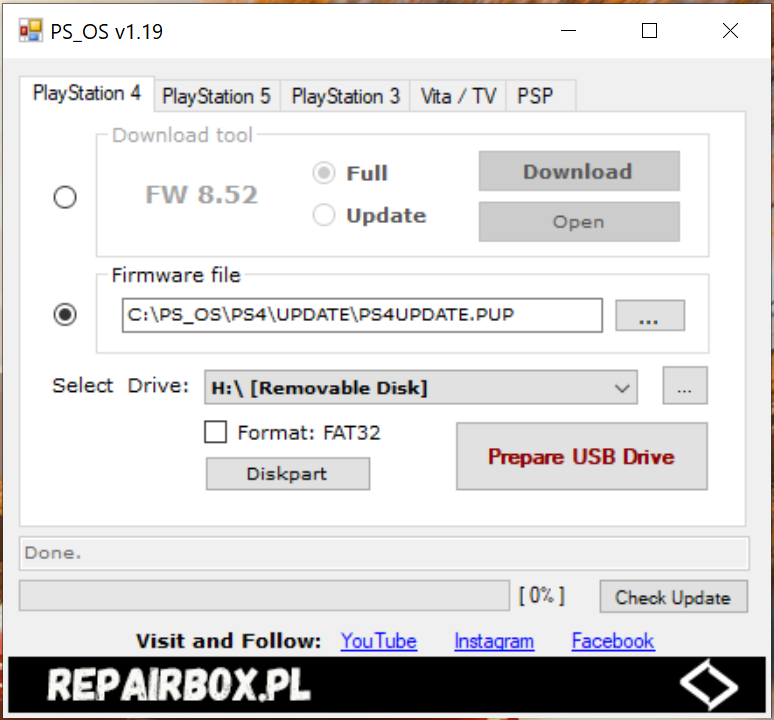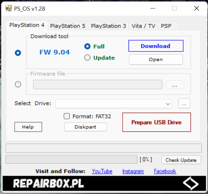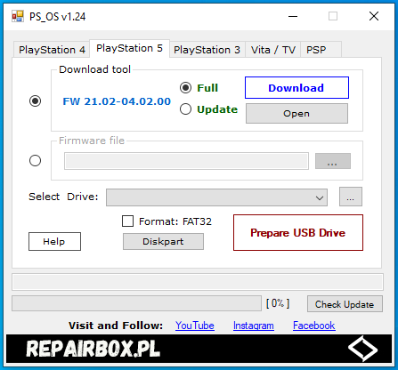 Po pobraniu oprogramowania (przycisk Download) mamy możliwość automatycznego przygotowania pendriva czyli sformatowanie na Fat32, stworzenie odpowiednich folderów i skopiowanie pobranego pliku oprogramowania. Poniżej opiszę całą procedurę przygotowania plików dla PlayStation 4 (po uruchomieniu wystarczą 3-4 kliknięcia
