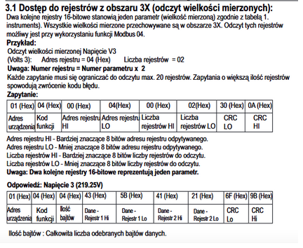 Mama taki temat - po RS485 odczytuje dane z miernika parametrów sieci - na ten moment zrobiłem to w PC i wszystko działa ładnie. Teraz chciałbym to samo zrobić w Bascomie z wykorzystaniem modbus.lbx ale zupełnie nie wiem czy w ogóle można tą bibliotekę do tego wykorzystać? Nie znalazłem nic podobnego w sieci. Ramka zapytania / odpowiedzi miernika wygląda jak poniżej.