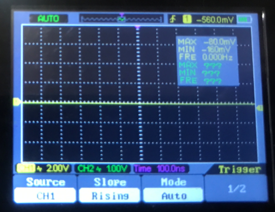 No i tu już zobaczyłem pierwszą dziwną rzecz. Hantek nie chciał mi automatycznie centrować przebiegu gdy wciskałem "auto" w trybie DC coupling, musiałem to robić ręcznie. Na Rigolu nie ma takich problemów. Możliwe, że coś robię źle, albo to jest jakieś drobne niedociągnięcie firmware Hanteka. Ale to nie problem, można sobie przesunąć klawiszami ze strzałkami. Po prostu jak początkujący wciśnie "Auto" i nie zobaczy i tak przebiegu to może się zdziwić. Z kolei Rigol to ogarnia i nie ma tego problemu.