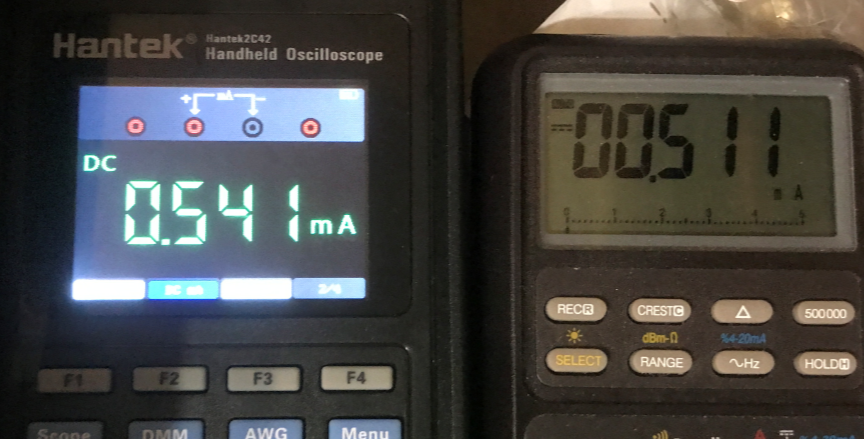 Hantek ma też funkcjonalności multimetru, chociaż nie reaguje tak szybko jakbym tego chciał, dodatkowo zauważyłem, że zgasił mi ekran w trakcie pomiaru rezystora, więc chyba czas oczekiwania na zgaszenie ekranu liczy się od ostatniego wciśnięcia klawisza a nie od ostatniego pomiaru...