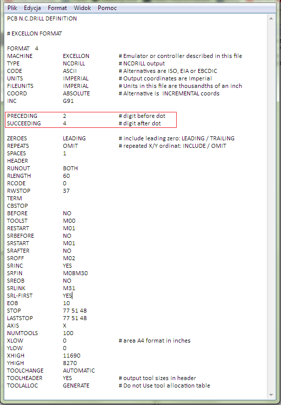 Wygląda na to że problem częściowo się rozwiązał. Chodzi o to że plik wierceń nie ma dokładnie sprecyzowanego formatu liczb i w głównej mierze rozchodzi się o to jak jest generowany G-kod, czyli zera wiodące i zera końcowe w generowanych współrzędnych wiertarki. Jest to wyszczególnione w pliku excellon.usr tu: