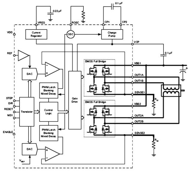 Na przykład układ A3982 firmy Allegro to kompletny sterownik silnika krokowego z wbudowanym translatorem dla łatwej obsługi. Posiada on wszystkie elementy – kontroler, jak i tranzystory mocy – zintegrowane w jednej obudowie. Zaprojektowany jest do sterowania bipolarnymi silnikami krokowymi w trybach pełnego i pół kroku. Sterownik ten może dostarczyć sygnał wyjściowy do 35 V i ±2 A. Tryb działania kontrolera można wybrać poprzez podanie sygnału na STEP pin wejściowy, jak pokazano na schemacie blokowym na rysunku 1.