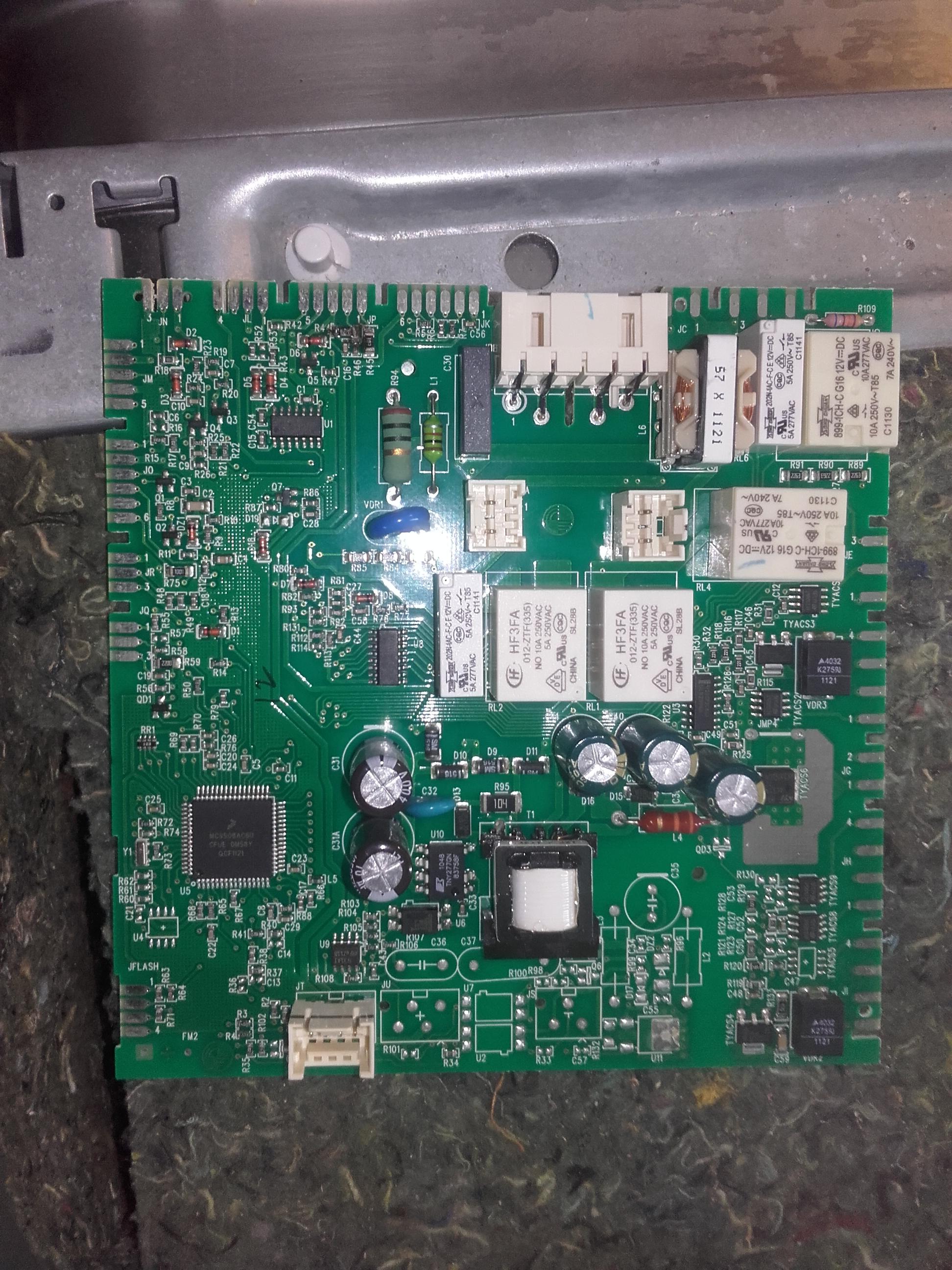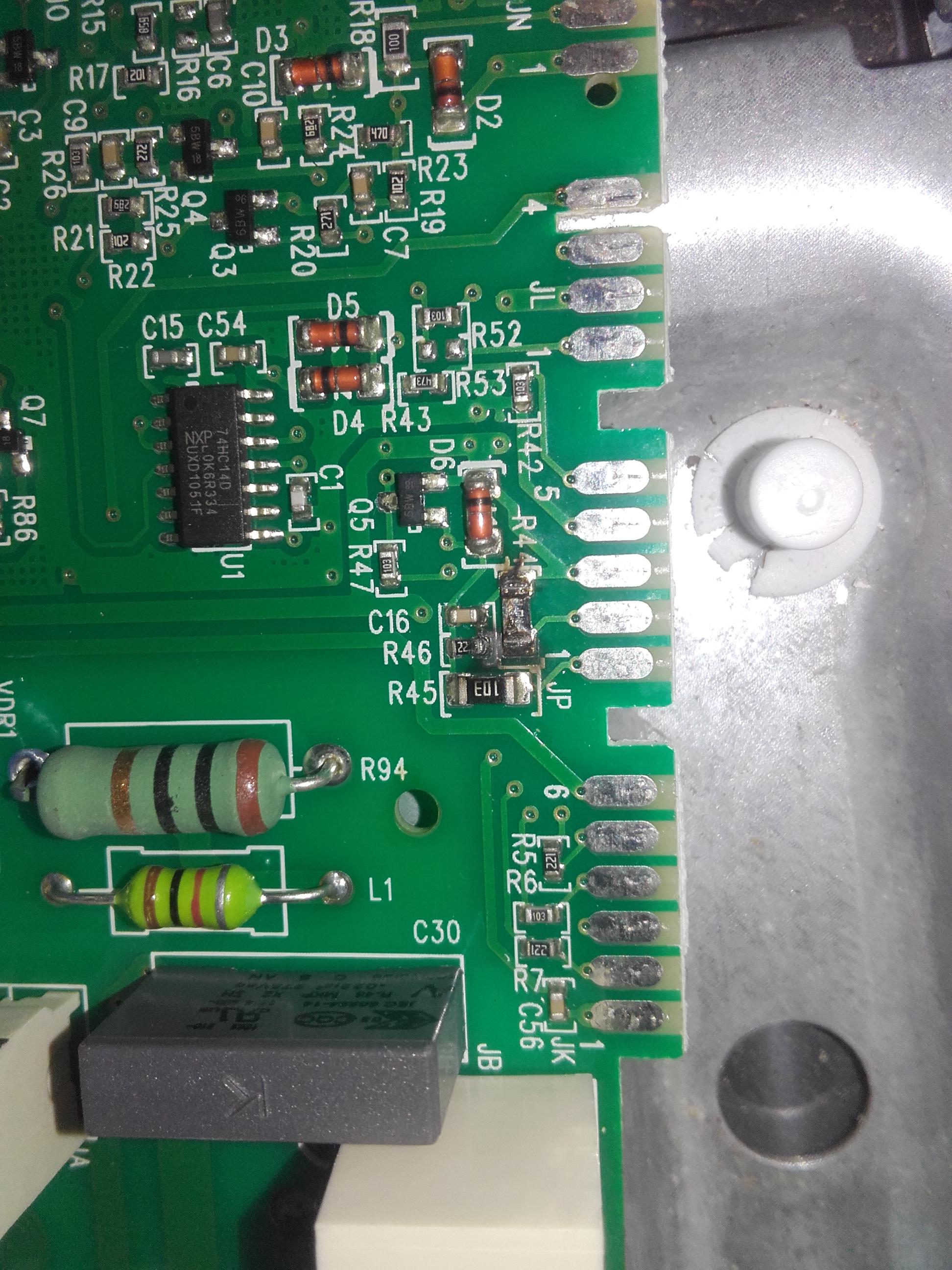Zmywarka trafiła do mnie na niegrzanie wody. Okazało się że na module sterowania spalone są dwa rezystory R44 i R45 w obwodzie tacho pompy myjącej.