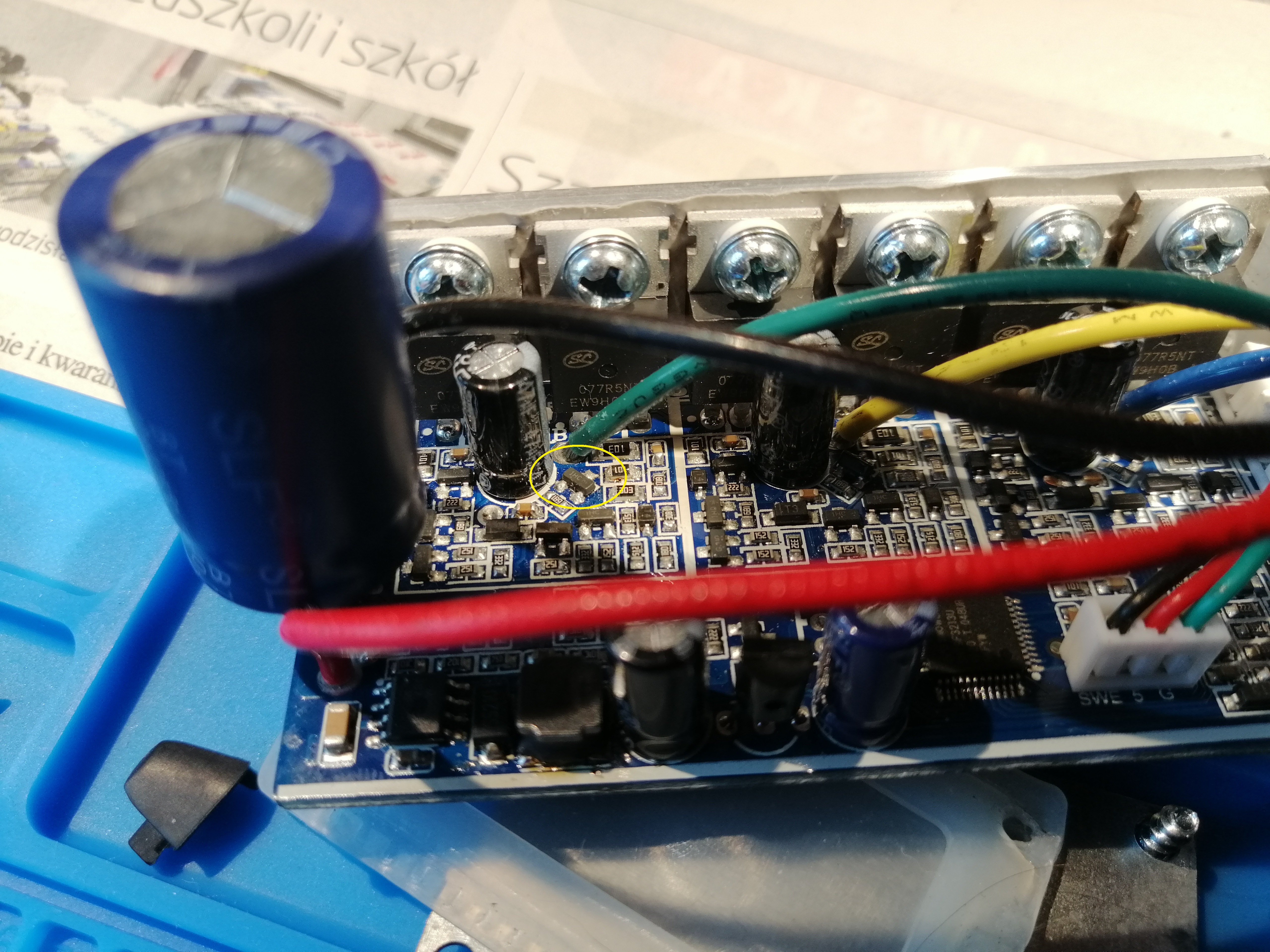 W hulajnodze podstawiłem natomiast z drugiego sterownika tranzystory 1HC i w zasadzie teraz te tranzystory po włączeniu licznika w momencie się nagrzeją (na wszystkich 3 fazach) więc za długo nie mogę mieć tego włączonego i w zasadzie objawy też są bez większych zmian czyli po przyciśnięciu manetki i pokręceniu kołem, koło zaczyna szarpać. Dodatkowo wylutowałem wszystkie tranzystory z jednej fazy i je dokładnie pomierzyłem (wszystkie ok), pomierzyłem wszystkie elementy bierne i dokonałem pomiarów względem wszystkich 3 faz i nic nie rzuca się w oczy poza tym, że nowe tranzystory po wlutowaniu od razu się grzeją, nawet bez podłączonego silnika.