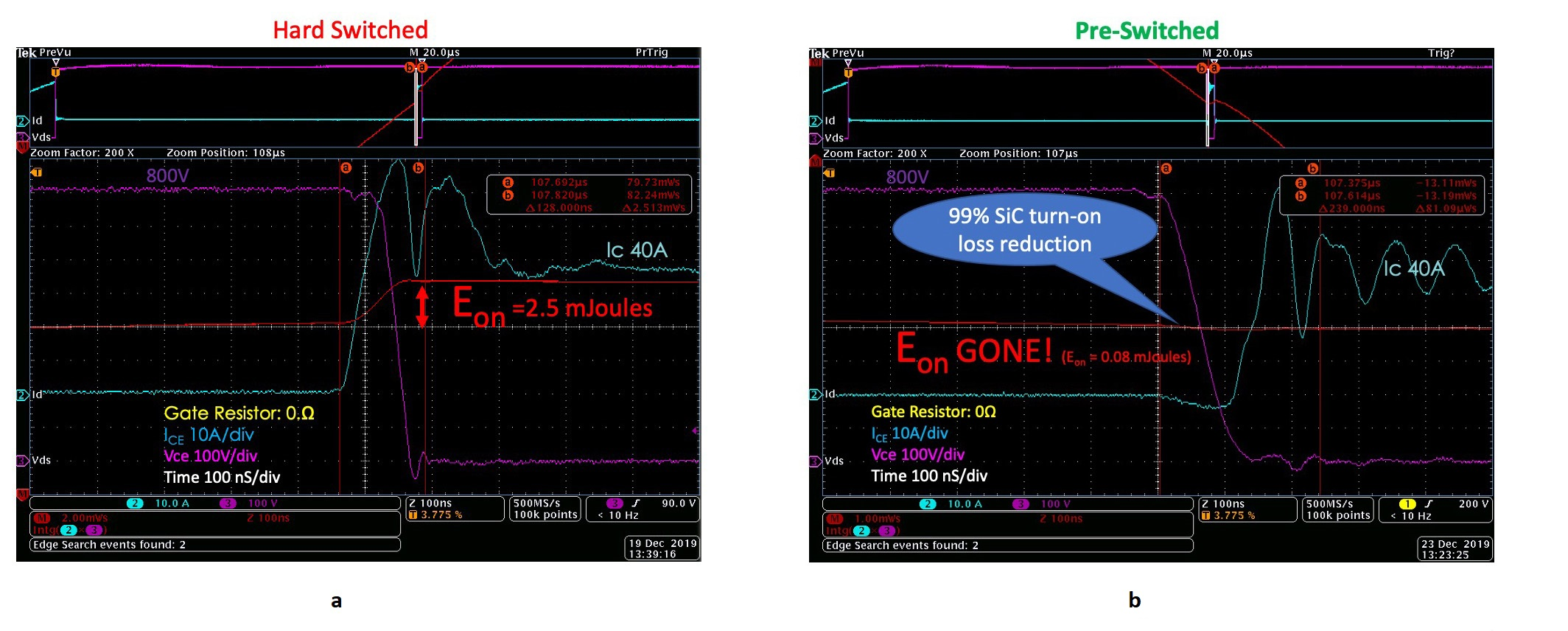 Rys.3. Porównanie strat podczas włączania przy użyciu „twardych” technik przełączania (a) z architekturą Pre-Switch (b).