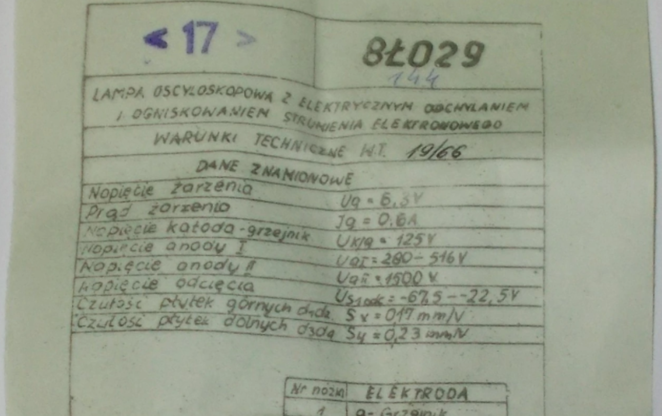 Witam, zakupiłem lampę oscyloskopową 8ŁO29 i chcę na niej zbudować prosty oscyloskop, na nocie katalogowej wszystkie parametry lampy są dla mnie jasne poza jednym, mianowicie co to jest napięcie katoda-grzejnik? Czy muszę połączyć jeden pin grzejnika do katody przez opornik? Proszę o odpowiedź osoby które się znają na "rzeczy". Z góry dziękuję za pomoc.