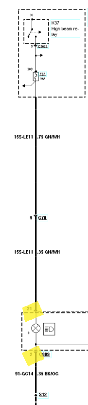 jeśli do pinu 21 podłączysz +12V, a do pinu 2 GND, to zaświeci się kontrolka świateł drogowych.