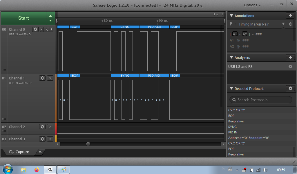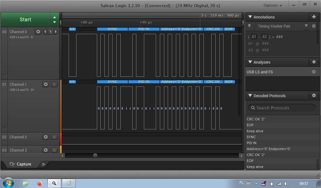 gaskoin napisał: W ostatnim przypadku Atmega nie odpowiedziała nawet na żądanie o deskryptor... Komunikacja wchodzi w stan IDLE i tyle. Idealnie by było jakbyś w sofcie dodał jakieś logowanie komunikacji żeby zobaczyć co robi w tym czasie Twój procesor. Możesz dodać najprostsze wysyłanie przez RS232. Oscylogram też by się przydał bo te przebiegi co ostatnio wrzuciłeś wyglądają mi bardzo podejrzanie (napięcia coś nie teges).