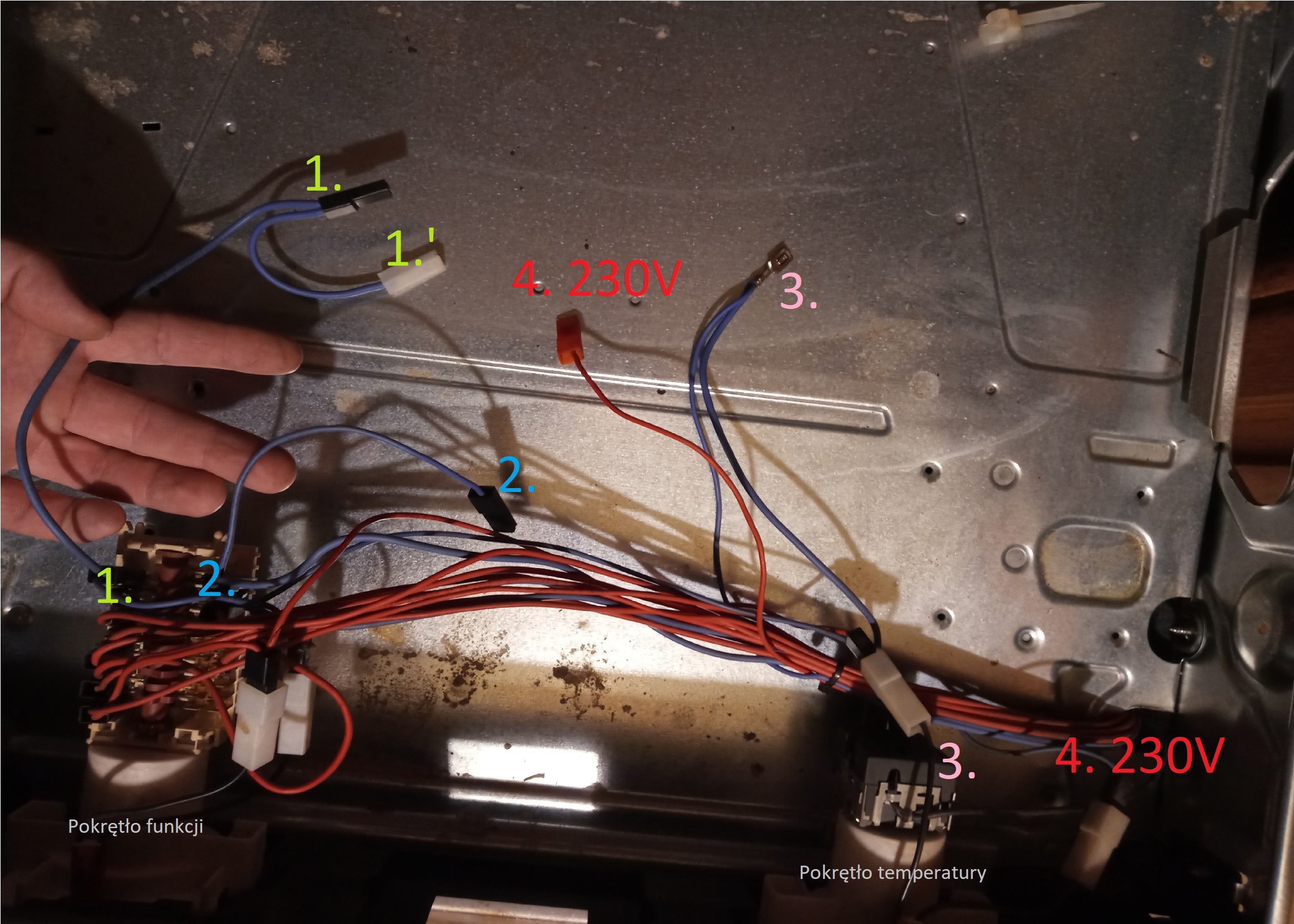 Na zdjęciu nr. 3, kabel nr 1 oraz 2 są podłączone do dwóch różnych pinów pokrętła odpowiedzialnego za wybór programu. Pokrętło nr. 3 odpowiada za wybór temperatury.