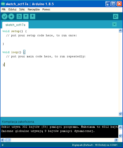 Szkic używa 302 bajtów (5%) pamięci programu. Maksimum to 6012 bajtów.
