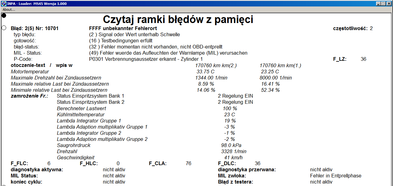 Ściągnąłem listę błędów i proszę o pomoc w odczytaniu przyczyny, ponieważ udało mi się rozszyfrować wypadanie zapłonu cylinder 1 i 2. Dodatkowo błąd 1 pojawia się krótko po skasowaniu i nie wiem czego dotyczy (bieg wsteczny?):