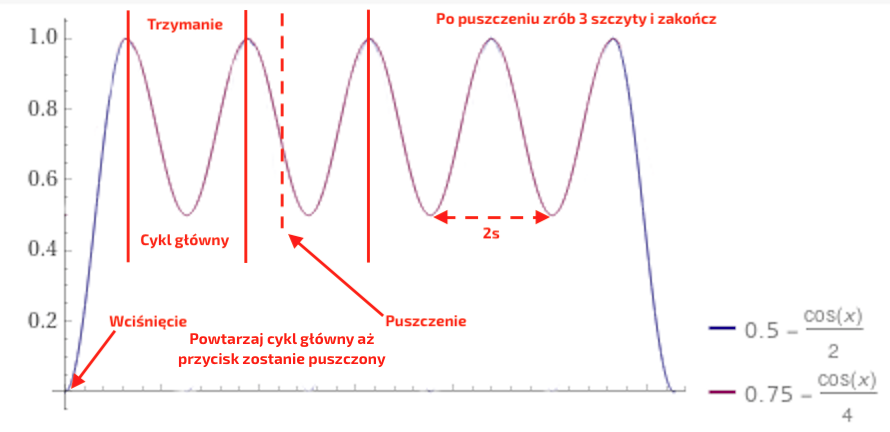 Trzymanie przycisku podtrzymuje animację. Puszczenie przycisku kończy animację po 3 szczytach, chyba że przycisk znowu zostanie wciśnięty.