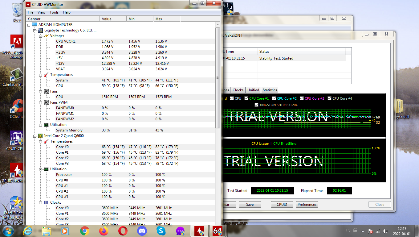 Teraz już przechodząc do OC. Mnożnik zostawiłem 9, FSB ustawiłem na 400. Zmieniłem też taktowanie PCIe na 100MHZ. Napięcie 1.575V jak w temacie. Niestety nawet na 1.55V wykrzaczał się po nie więcej jak 10 min obciążenia w AIDA64.