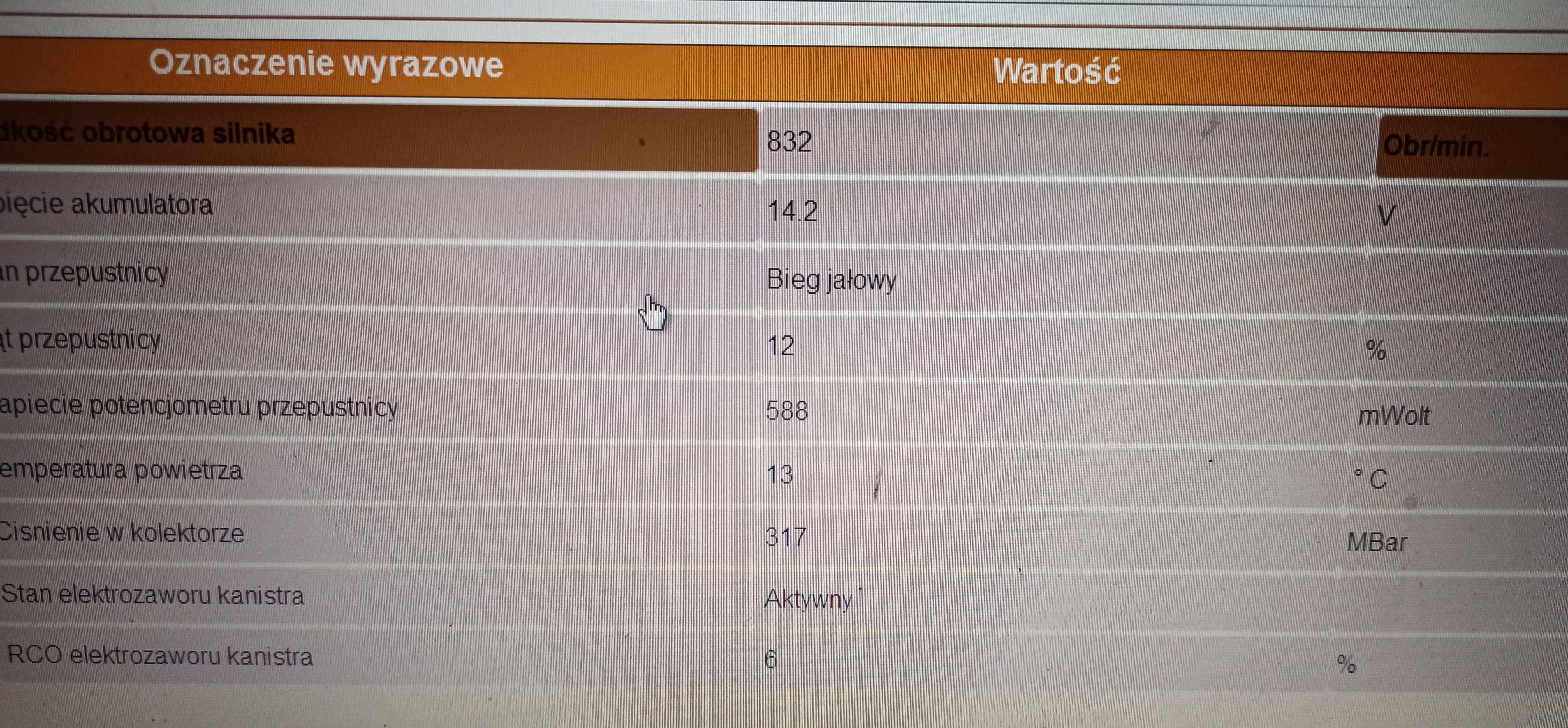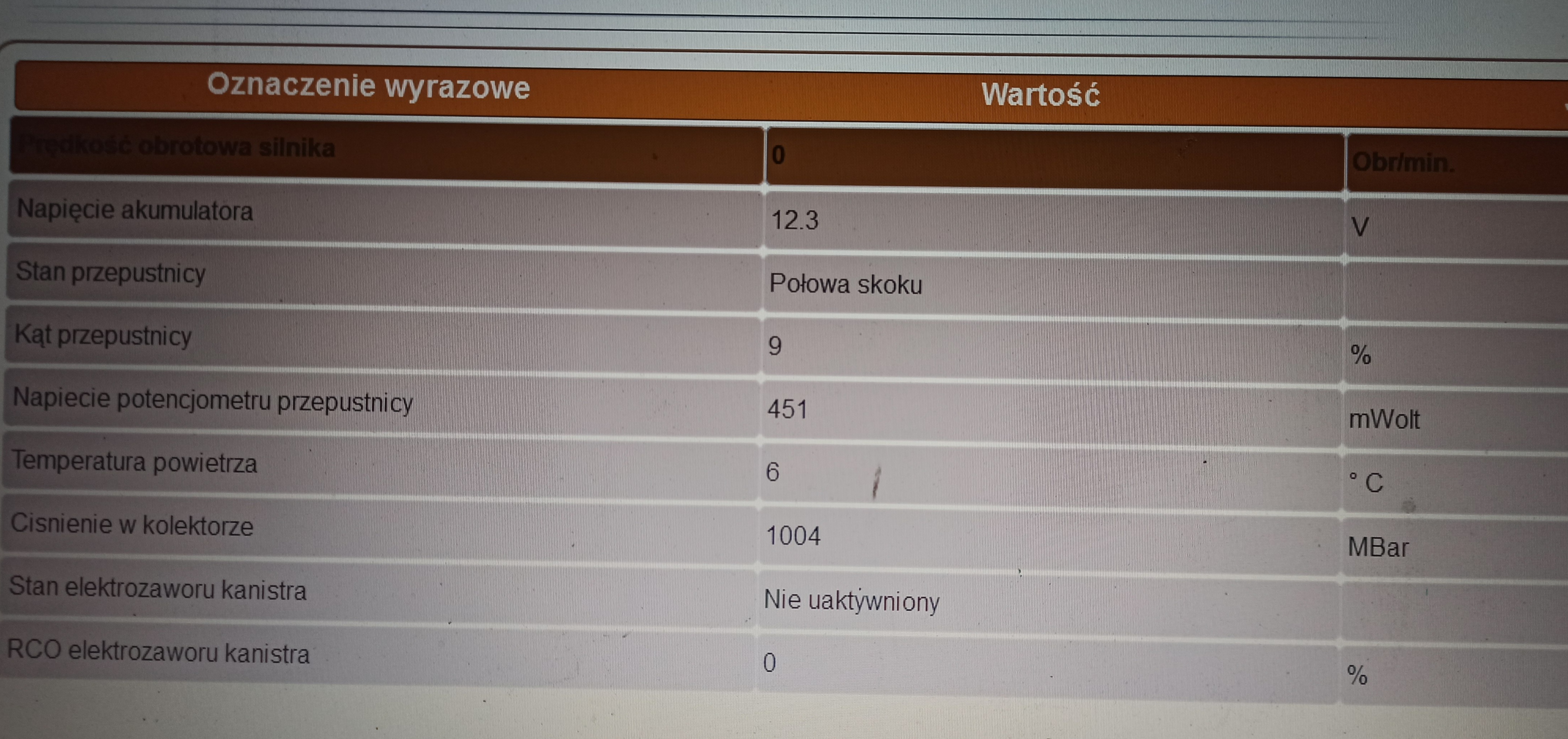 Sterownik to Valeo J34P. Sterownik nie posiada żadnych błędów w pamięci. Parametry mierzone tez wyglądają ok Ciśnienie atmosferyczne 998mbar przed odpaleniem, po odpaleniu 330mbar. Temperatura zasysanego powietrza zgadza się z rzeczywista, temperatura cieczy również jest prawidłowa, sondy lambda pracują prawidłowo.