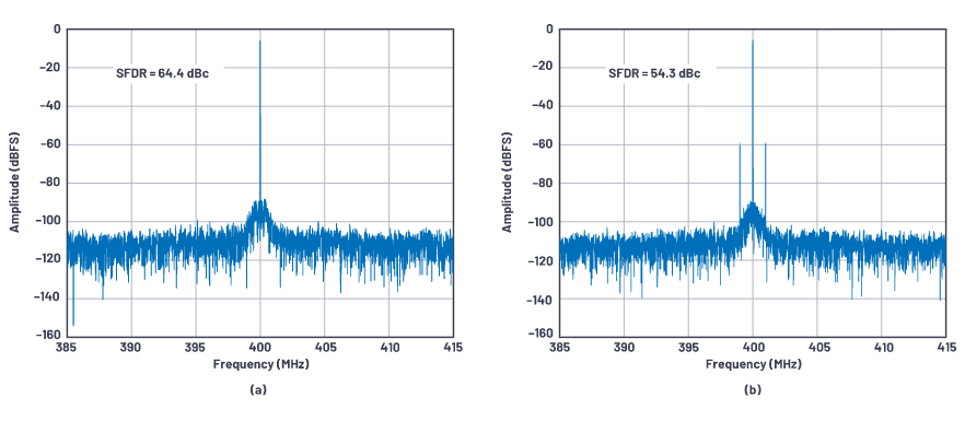 SFDR można określać w odniesieniu do pełnej skali (dBFS) lub względem sygnału nośnego (dBc). Tętnienia zasilania mogą wytwarzać niepożądane prążki poprzez sprzężenie z sygnałem nośnym, co degraduje SFDR. Rysunek 1 porównuje SFDR dla szybkiego ADC AD9208, gdy jest zasilany przez czysty i zaszumiony zasilacz. W tym przypadku szum zasilania degraduje SFDR o około 10 dB, gdy tętnienie zasilania przy 1 MHz pojawia się jako modulowane impulsy obok częstotliwości nośnej w widmie wyjściowym szybkiej transformacji Fouriera (FFT) przetwornika ADC.