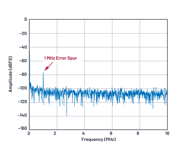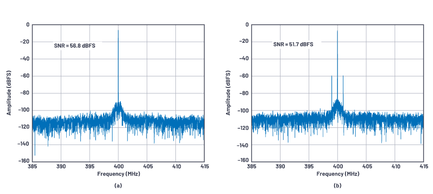 Zakłócenia wprowadzane przez zasilacz mogą przyczyniać się do zmniejszenia SNR poprzez sprzężenie w sygnale nośnym i dodanie składowych widmowych szumu w sygnale wyjściowym. Jak pokazano na rysunku 2, SNR szybkiego przetwornika ADC AD9208 spada z 56,8 dBFS do 51,7 dBFS, gdy tętnienie zasilania o częstotliwości 1 MHz wytwarza składowe szumu widmowego w widmie wyjściowym widoczne na FFT.