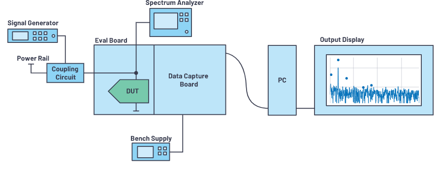 AC PSRR jest mierzone poprzez wprowadzenie sygnału sinusoidalnego na pin zasilania urządzenia i obserwację błędu na jego wyjściu, który pojawia się w postaci zmiany poziomu szumów w widmie wyjściowym przetwornika danych/transceivera przy częstotliwości zakłócenia w zasilaniu (rysunek 4). AC PSRR definiuje się jako stosunek zmierzonej amplitudy wstrzykiwanego sygnału do odpowiedniej amplitudy impulsu błędu w widmie wyjściowym, gdzie: