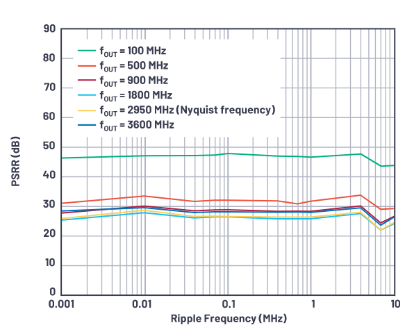Rysunek 5 przedstawia schemat blokowy typowej konfiguracji PSRR. Na przykładzie szybkiego przetwornika ADC AD9213 10 GSPS — fala sinusoidalna 1 MHz i 13,3 mV p-p jest aktywnie sprzężona na analogowej szynie zasilającej 1,0 V. Odpowiednia cyfrowa wypustka 1 MHz pojawia się powyżej poziomu szumów widma FFT –108 dBFS przetwornika ADC. Cyfrowa wypustka 1 MHz wynosi –81 dBFS, co odpowiada napięciu międzyszczytowemu 124,8 μV w odniesieniu do pełnego zakresu wejścia analogowego 1,4 V p-p. Obliczenie AC PSRR przy 1 MHz, stosując równanie 4, daje AC PSRR 40,5 dB przy 1 MHz. Rysunek 6 pokazuje AC PSRR AD9213 dla szyny AVDD 1.0 V.