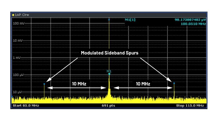 Modulację zasilania uzyskuje się przez podłączenie wejściowego sygnału tętnienia do modulatora sterującego czystym napięciem stałym za pomocą dedykowanego obwodu sprzęgającego. Tętnienie zasilania jest wprowadzane z generatora sygnału do pinu zasilacza jako sygnał sinusoidalny. Fala sinusoidalna modulowana do nośnej RF tworzy prążki pasma bocznego o częstotliwości przesunięcia równej częstotliwości fali sinusoidalnej. Na amplitudę prążków bocznych ma wpływ zarówno amplituda fali sinusoidalnej, jak i czułość samego urządzenia. Uproszczona konfiguracja pomiaru PSMR jest taka sama, jak dla PSRR, co obrazuje rysunek 5. Jednak analizator wyjściowy koncentruje się na częstotliwości nośnej i jej wstęgach bocznych, jak pokazano na rysunku 7. PSMR jest zdefiniowany jako stosunek amplitudy tętnienia zasilania do modulowanej amplitudy wstęgi bocznej wokół nośnika, jak wynika z równania 5: