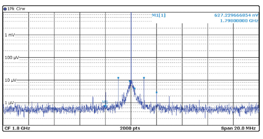 Rys.10. Widmo wyjściowe AD9175 DAC0 przy częstotliwości nośnej 1800 MHz przy użyciu przetwornicy DC/DC Silent Switcher LT8650S podłączonej bezpośrednio do szyny AVDD.