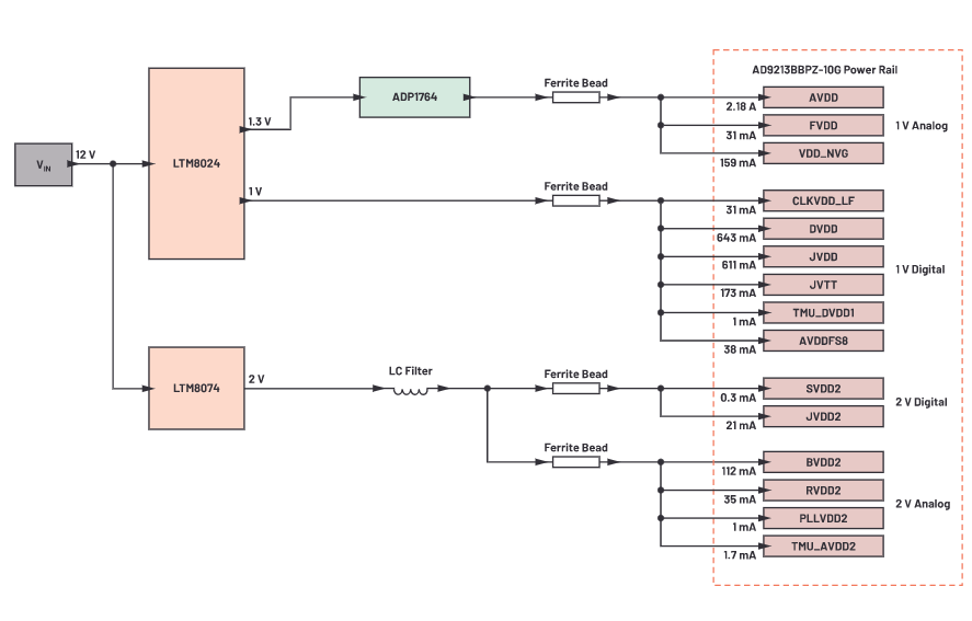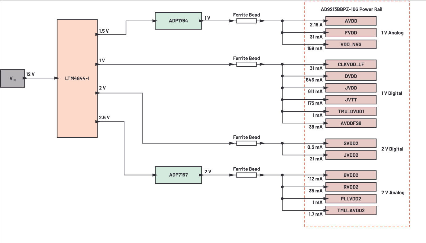 AD9213 wymaga 15 różnych szyn zasilających zebranych w cztery grupy: