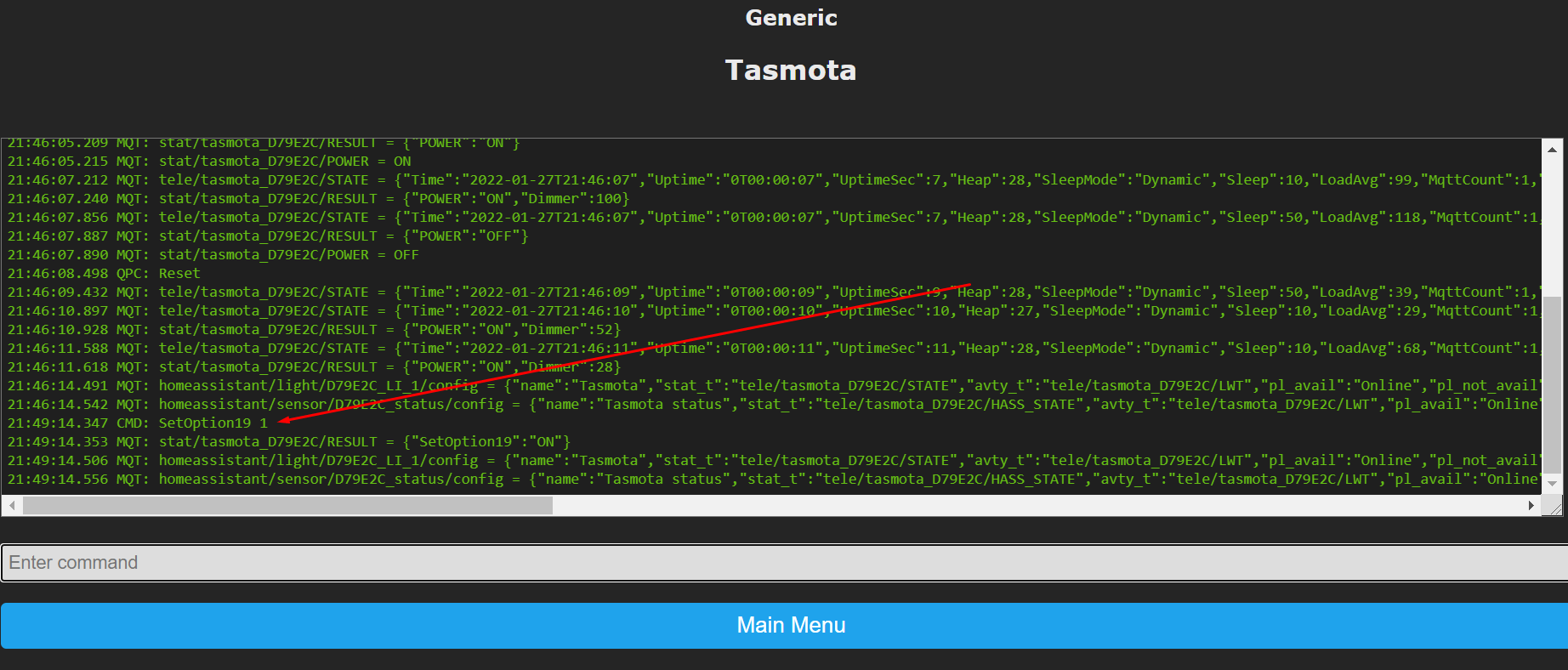 W Console od Tasmota upewniłem się, czy włączona jest opcja MQTT Discovery, wpisałem "SetOption19 1":