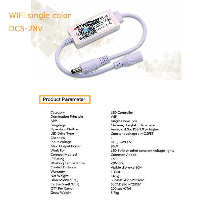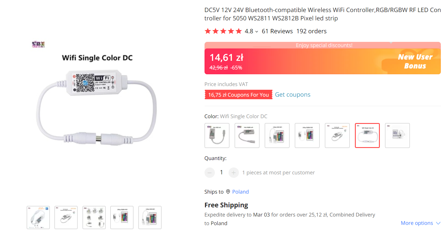 Produkt można znaleźć pod hasłem "DC5V 12V 24V Bluetooth-compatible Wireless WiFi Controller,RGB/RGBW RF LED Controller for 5050 WS2811 WS2812B Pixel led strip", choć to WS2812B i WS2811 nie powinno mieć miejsca w jego nazwie, gdyż nie obsługuje on protokołu tych LEDów. Bluetooth też nie ma raczej - jest WiFi. Produkt ten to zwykły ściemniacz jednokanałowy LED zrealizowany na PWM i tranzystorze: