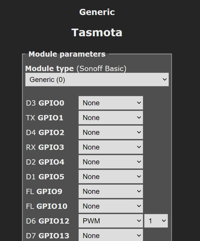 Konfiguracja Tasmoty jest banalnie prosta. Nie mamy tu nawet przycisków. Po prostu znajdujemy na którym pinie jest PWM i ustawiamy mu tryb PWM. Po kolei sprawdzałem każdy pin by ostatecznie znaleźć konfigurację: