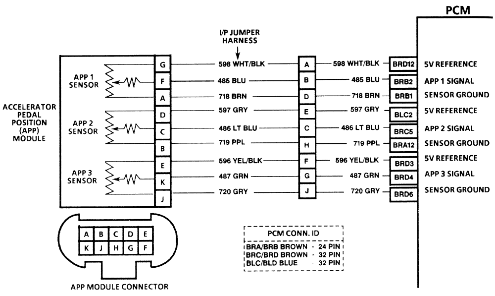 Dodam jeszcze, że gdy samochód pracował z pompą elektroniczną to sygnał położenia pedału gazu pobierany był na takiej samej zasadzie z 3 czujników w pedale gazu. Ja wpiąłem się czujnikiem TPS w instalację oryginalną w czujnik APP1 z poniższego schematu. Wg instrukcji serwisowej, jeśli komputer będzie miał 1 poprawny sygnał z 3 czujników APP to nie zostanie uruchomiony tryb awaryjny. Schemat: