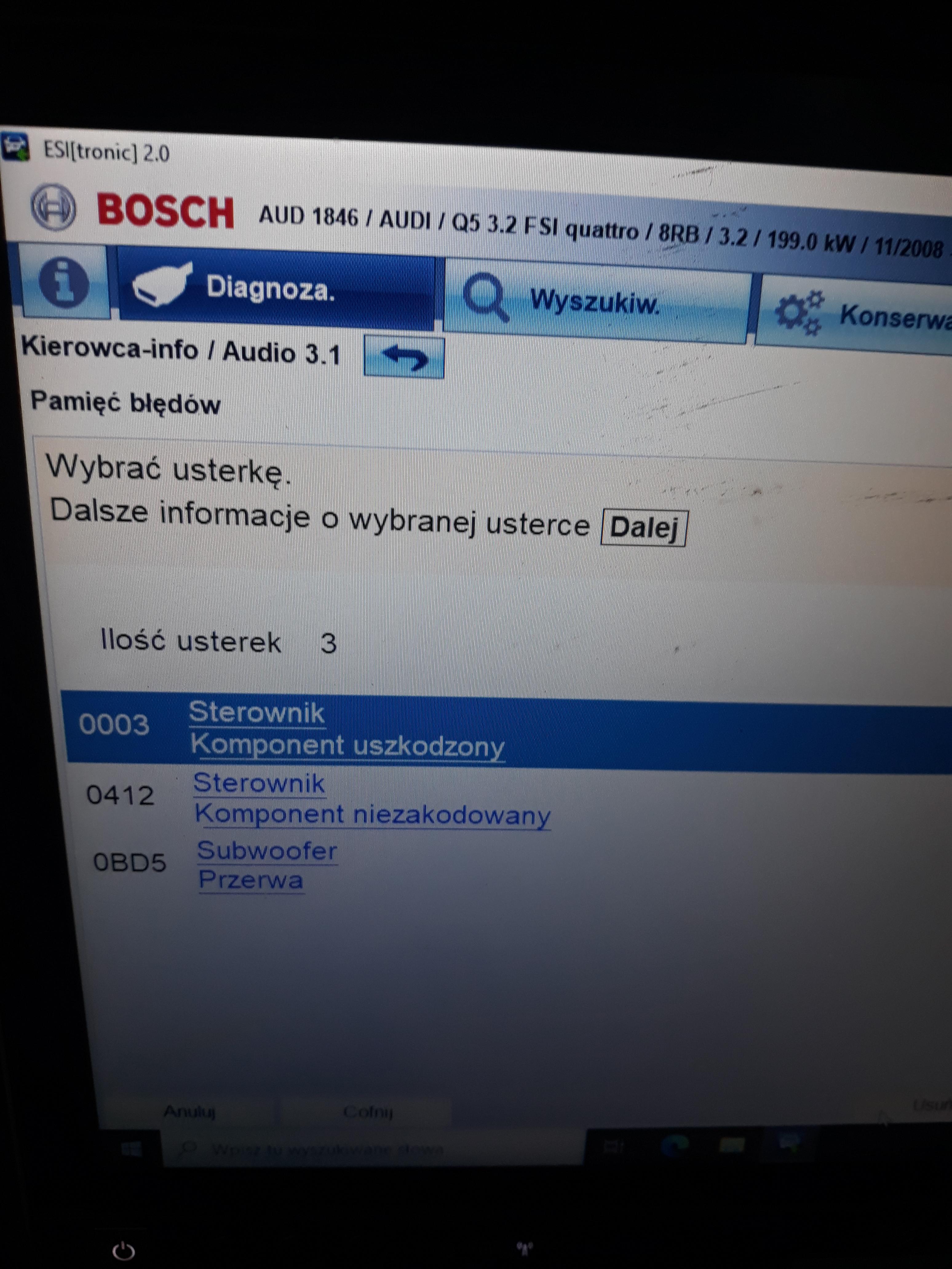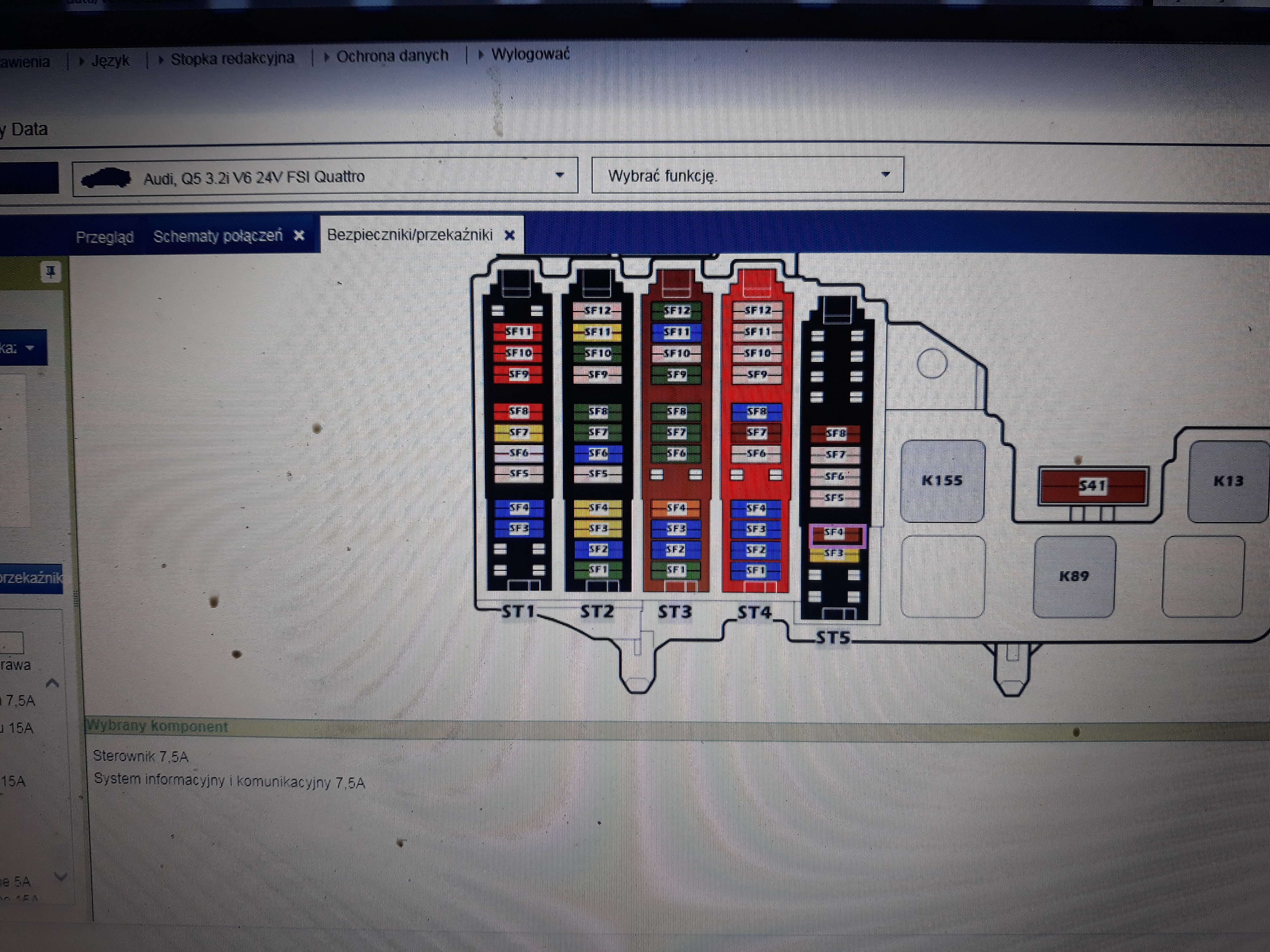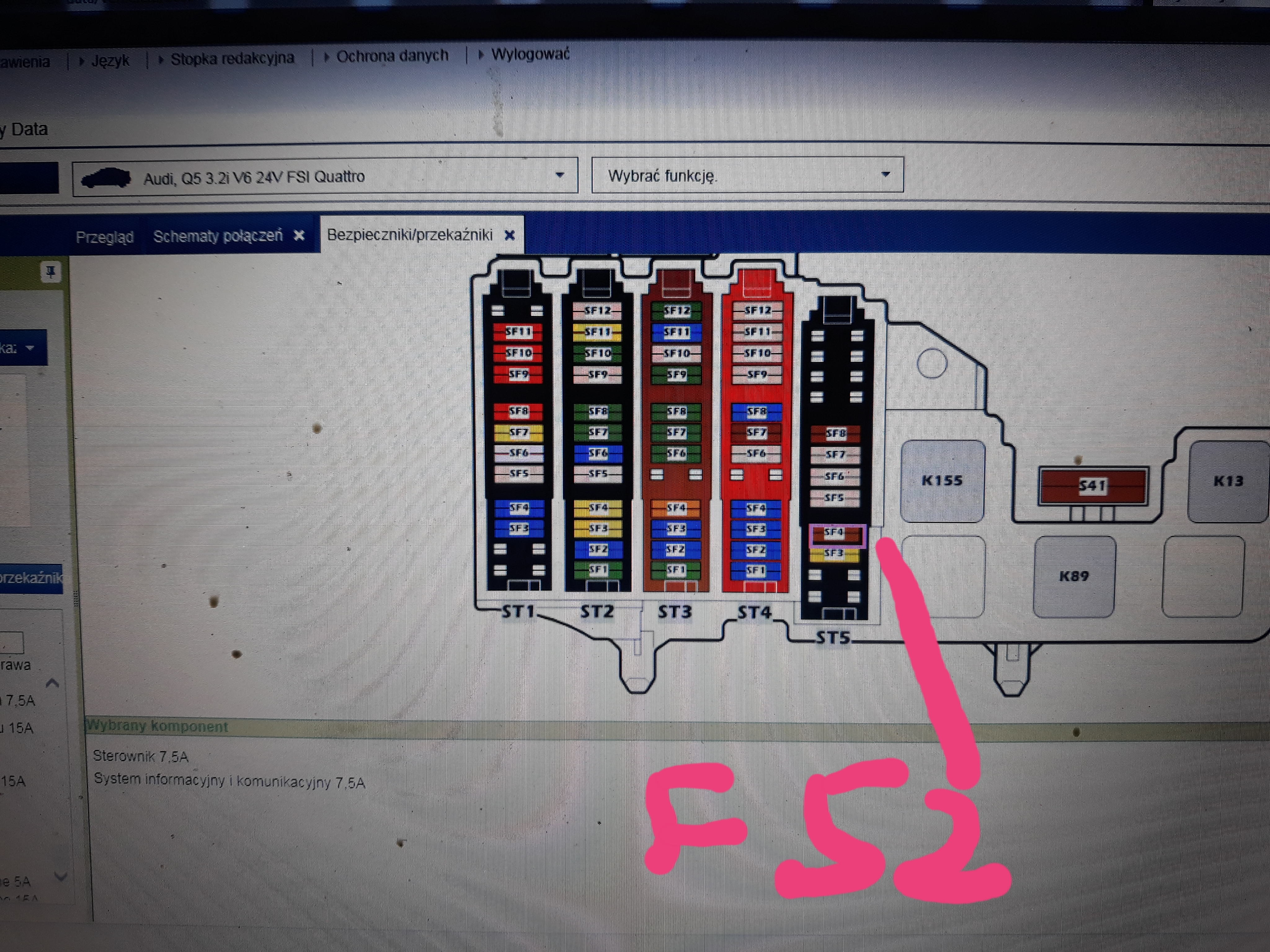 Witam mam na placu Q5 3,2 fsi QUATRO 8RB 2009r. Z poborem prądu spoczynkowego dochodzącym do 5A😲 po odłączaniu bezpieczników doszłem żeodpowiedzialny za tak duży prąd jest bezpiecznik F52 7,5A (skrzynka w bagażniku po prawej) od systemu informacyjnego . Odłączałem wtyczki od radia cyfrowego i pobór spadł do 1A . W momencie gdy wyjmę bezpiecznik F52 7,5A (skrzynka w bagażniku po prawej) pobór spada do 27mA . Czy możecie mi powiedzieć gdzie dokładnie znajduje się sterownik elektroniki systemów informacji J794 tak żeby niepotrzebnie za dużo rozbierać. Uważam że ten sterownik J794 MMI pobudza cały czas MOST mgistrale. W załączeniu dodam odczyt błędów oraz zdjęcie skrzynki bepieczników. Bardzo proszę o pomoc w dokładnym zlokalizowaniu złodzieja prądu.