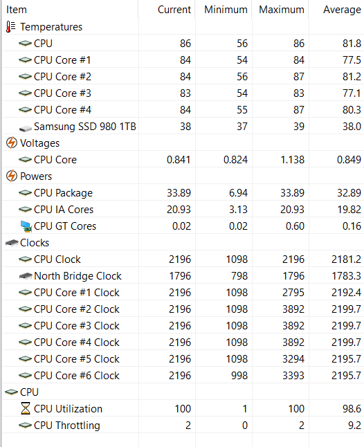 Witam, zrobiłem undervolting CPU -0,150 V. Procesor niestety dalej throttluje, co mogę zrobić żeby nie throttlował? Załączam zdjęcia statystyk z AIDA64 Extreme Test stabilności systemu. CPU : intel i7-8750H