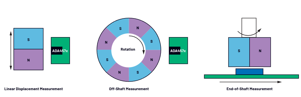 W konfiguracji z sensorem na końcu wału (patrz rysunek 1), czujnik znajduje się poniżej obracającego się magnesu dipolowego; tutaj bieguny północny i południowy tworzą jednolite pole nad środkiem elementu. Czujnik jest umieszczony w taki sposób, aby pole magnetyczne i mierzony detal znajdowały się w tej samej płaszczyźnie. Typowym zastosowaniem jest pomiar i sterowanie położeniem wirnika w bezszczotkowych silnikach prądu stałego (BLDC). W przypadku sensorów AMR, które są charakterystycznymi czujnikami kątowymi 180°, silnik musi być parzystobiegunowy; silniki z nieparzystą liczbą par biegunów wymagają informacji 360° do komutacji. W porównaniu z konwencjonalnymi czujnikami Halla, które są również używane w sterowaniu silnikami, sensory AMR, takie jak ADA4570 i ADA4571, mają wyższą precyzję. Zmniejszają również tętnienia momentu obrotowego i zapewniają dane o realnej mocy na podstawie bezwzględnych informacji o położeniu wirnika po uruchomieniu, jak i w stanie bezczynności, niezależnie od pozycji silnika.