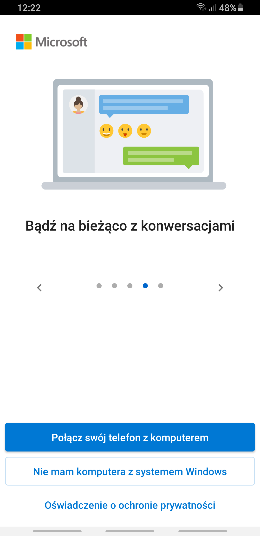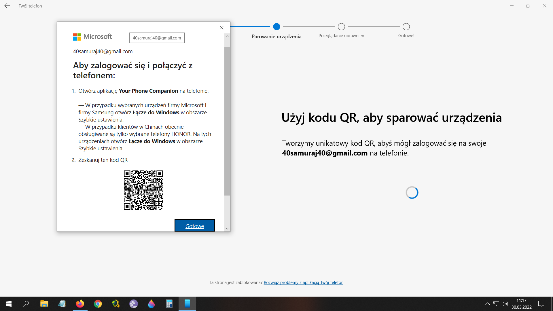Witam chciałbym połączyć telefon z komputerem PC poprzez wifii. Wchodzę w zakładkę Twój telefon (Windows10) pojawia mi się informacja tj kod QR jak na załączniku poniżej nr 1. Następnie w telefonie najeżdżam na kod QR i pojawia się informacja ,,Coś poszło nie tak kontynuuj parowanie ręcznie,,. Gdy w telefonie klikam kontynuuj tylko pojawia się ładowanie i kręcące się kropki i nic dalej nie idzie (załącznik nr 2) . Wspólne środowisko mam ustawione włączone (załącznik nr 3).