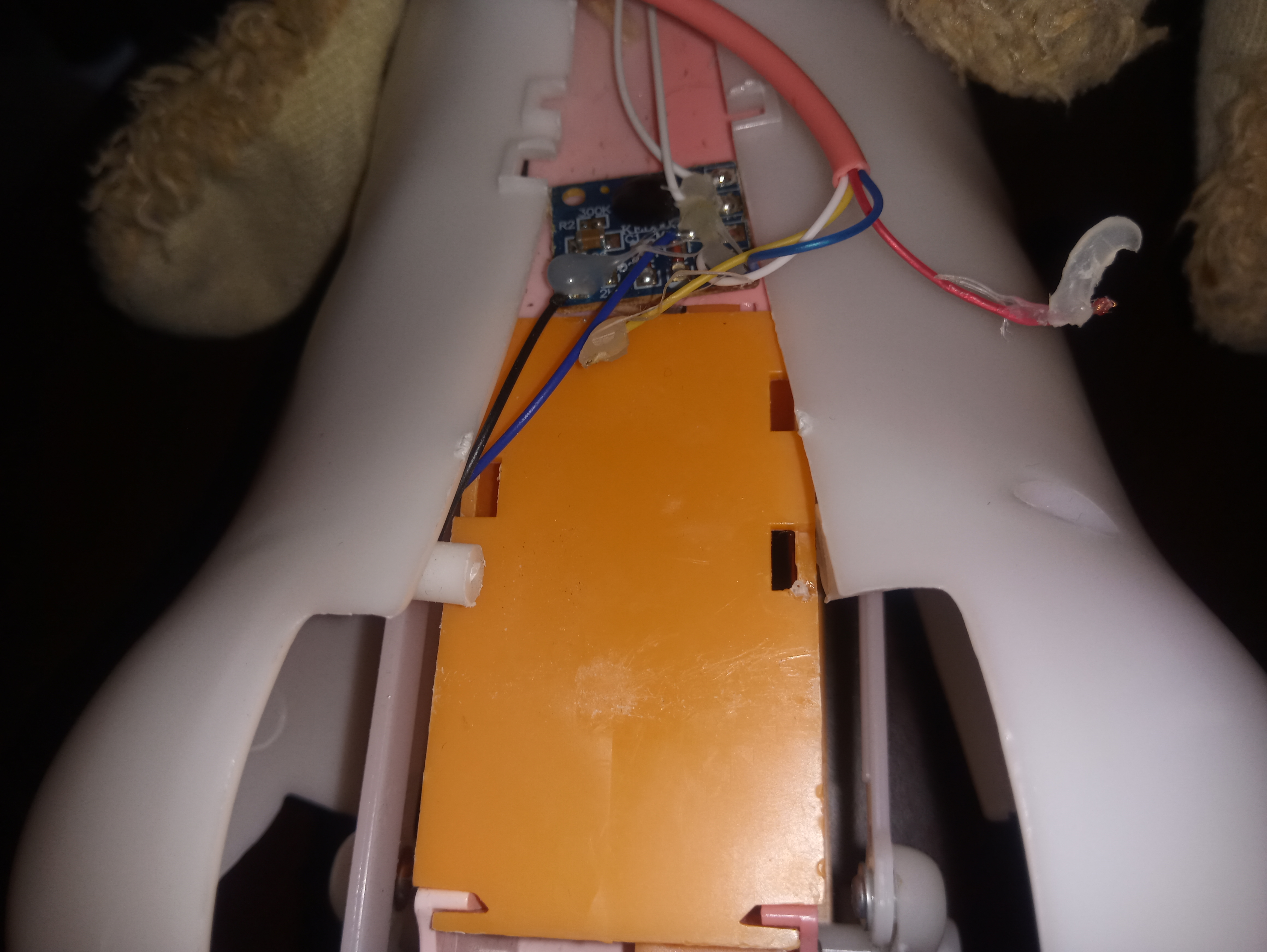 W środku zauważyłem dwa oderwane kabelki - żółty i czerwony. Nie wiem jednak gdzie one powinny być podłączone. Czerwony podejrzewam, że do "+" baterii, a żółty nie wiem czy "-" czy do płytki.