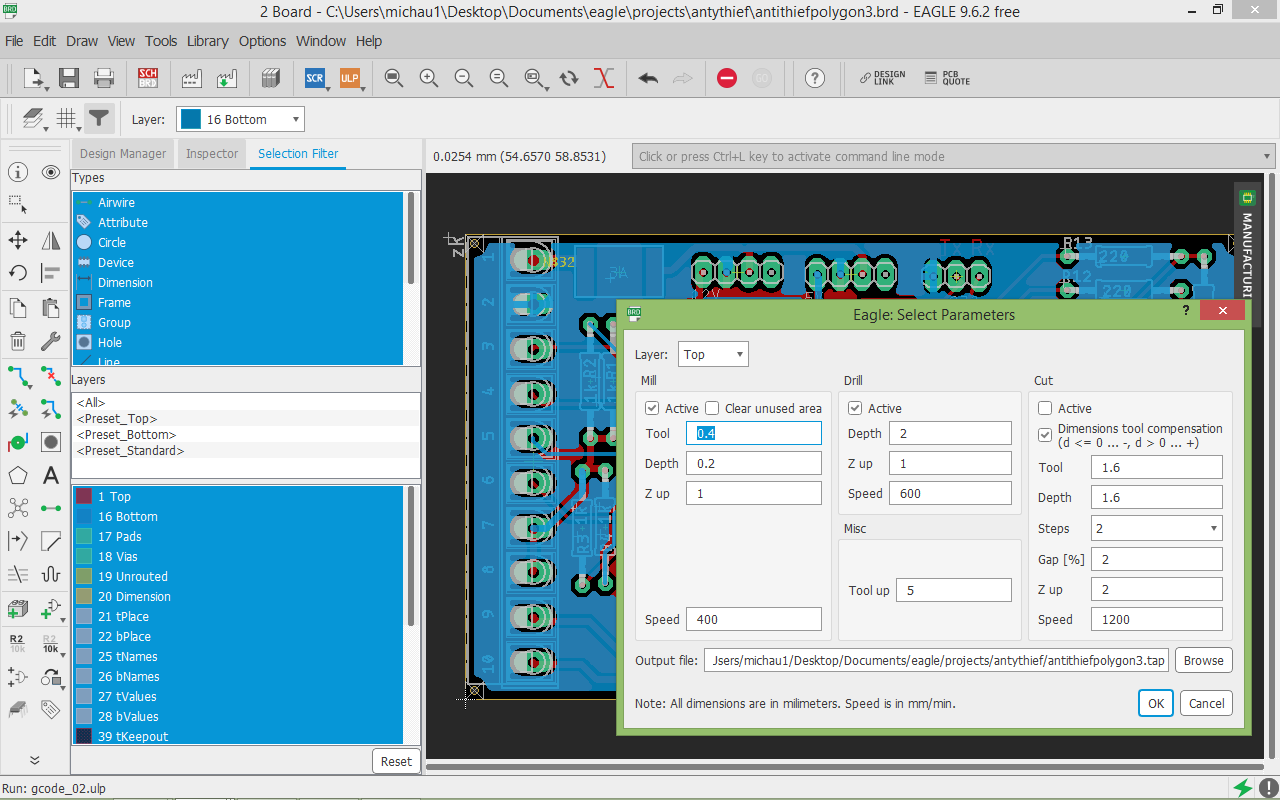 #1 19969915 08 Kwi 2022 15:35 elektrofil elektrofil Poziom 17 #1 19969915 08 Kwi 2022 15:35 Witam, problem jak w temacie, po wyfrezowaniu (wierceniu) nie zgadza się rozmiar elementów np AtMega 8 ma 21mm zamiast 34, wszedzie jednostki ustawione na mm. Frezarka której używam to 3018. Wersja eagle to 9.6.2. Załączniki: antithiefpolygon3.top.drill.rar Download (1.37 KB)