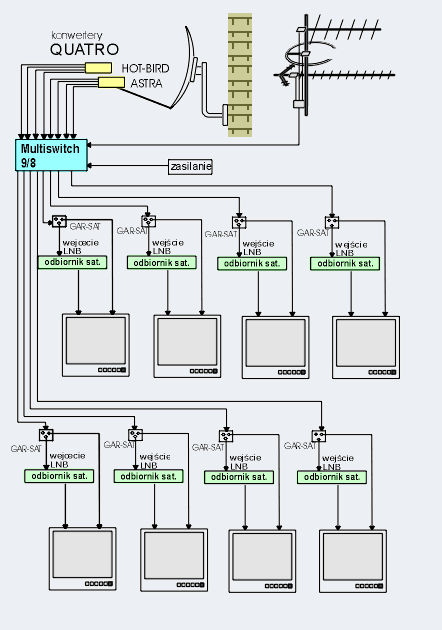 Planuje modernizacje swojej instalacji telewizyjnej, do tej pory mam jedną antenę siatkową do odbioru telewizji naziemnej, rozdzieloną na 5 telewizorów (odbiorników), gdzie od jednego TV idzie zasilanie antenowe. Chcę zmodernizować tę instalacje, ale nie chce ciągnąć nowych kabli. Dodać do tego chcę antenę FM oraz antenę satelitarną (planuje kupić 2x dekoder satelitarny a w przyszłości może i do reszty odbiorników). Chciałbym, aby instalacja wyglądała tak jak na przykładowym schemacie, który zrobiłem: