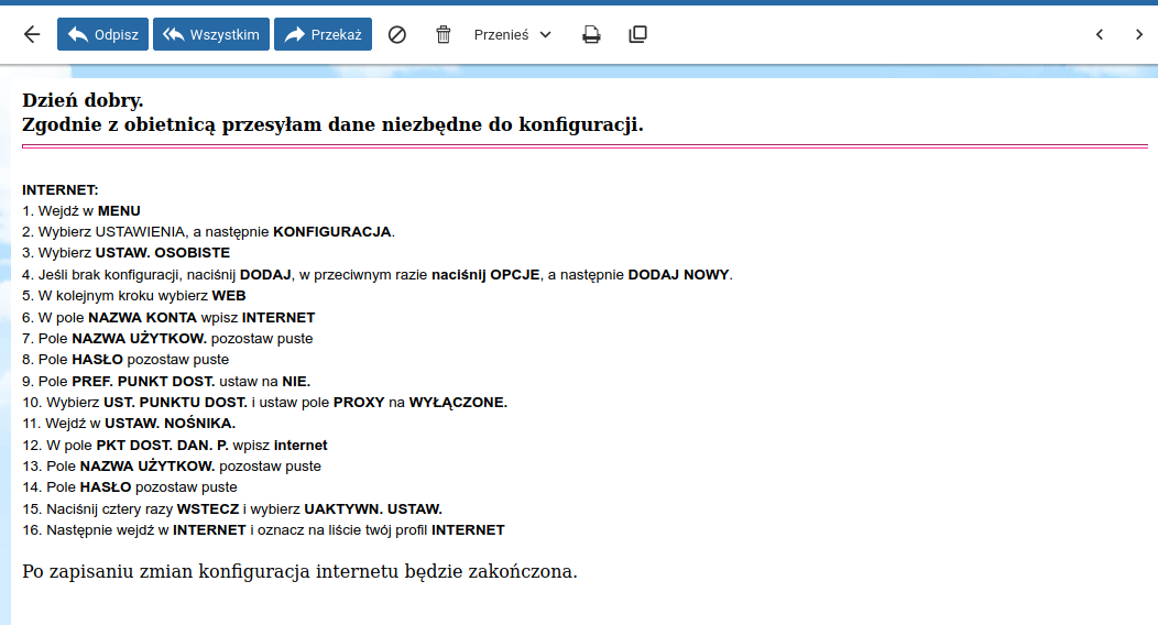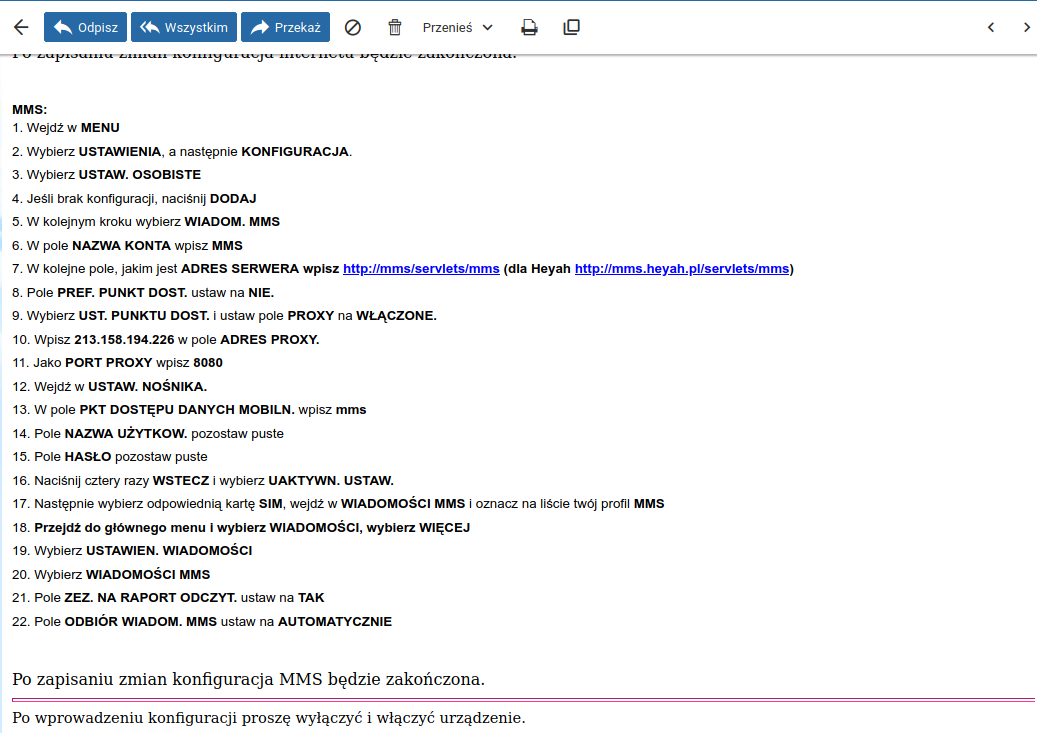 Niestety automatyczne smsy konfiguracyjne, o które prosiłem bezpośrednio w supporcie podczas rozmowy, nie dotarły - dwa razy próbowali. Tak więc wysłali ręczną konfigurację na maila. Załączam tutaj do posta.