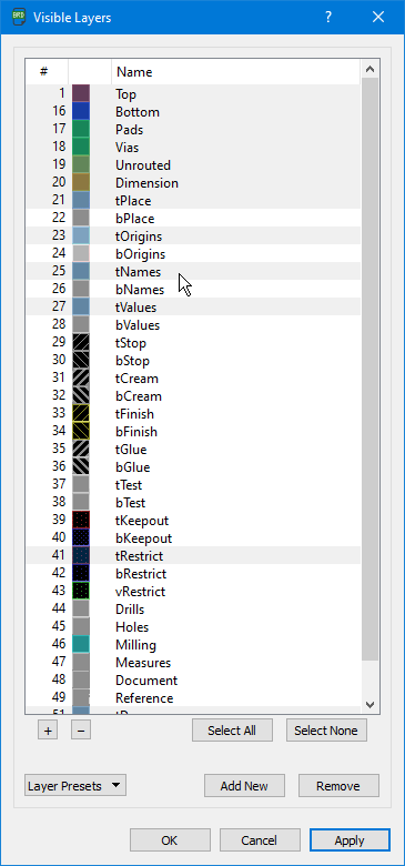 Klikając na kolorowym kwadraciku przypisanym danej warstwie otworzy się małe okienko widoczne poniżej, gdzie mamy checkboxa Displayed, który decyduje właśnie o wyświetlaniu danej warstwy na płytce.