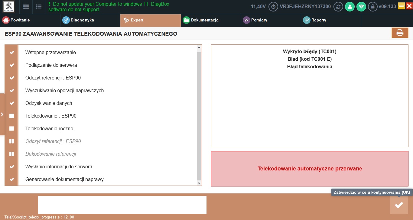 Po teletransmisji i update sterownika ESP/ABS w 508 z 2019 r , wyrzuciło błąd przy telekodowaniu..