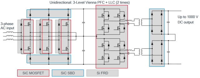 Topologia trójpoziomowa wymaga wydatniejszej liczby części niż dwupoziomowa i złożoności w zakresie sterowania bramką (szczególnie w konfiguracji dwukierunkowej), co może prowadzić do zwiększenia rozmiaru systemu. Jednak rozwiązanie trzypoziomowe oferuje redukcję całkowitych strat przełączania i zrównoważone charakterystyki w obrębie zakłóceń elektromagnetycznych. Z kolei w topologii dwupoziomowej liczba komponentów jest znacznie mniejsza, a gabaryty systemu można dalece zniwelować. Dzięki zastosowaniu nowoczesnej technologii SiC uda się również osiągnąć niskie straty przełączania i — w rezultacie — wysoką sprawność. Technologia SiC jest więc idealna dla punktów zasilania na prąd stały, nawet jeśli napięcie ładowania DC wynosi od 200 V do 800 V.